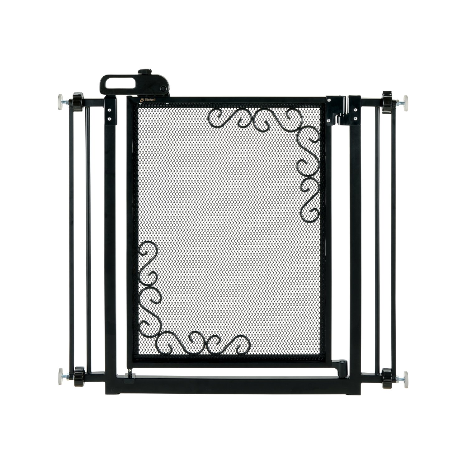 Crafted of durable metal and featuring an exquisite mesh screen, our One-Touch Metal Mesh Pet Gate has a new luxurious look! The tension-mount gate design stays firmly in place without damaging wall surfaces. The single button, easy lifting door handle allows for the smooth opening of the mesh door in either direction with just one hand. Easily carry items in one hand while opening the gate with the other. Add both ease of use and style to your home décor with the Richell One Touch Metal Mesh Gate. This functional work of art comes in either Black or Antique Bronze.